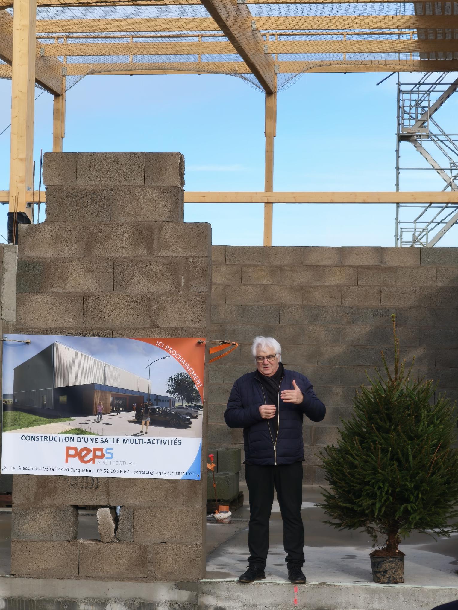 C’est monsieur le Maire, Jacques Praud, qui a hissé le sapin au sommet de la charpente. Cette tradition symbolise l’achèvement de la structure bois et rend hommage au travail des compagnons.